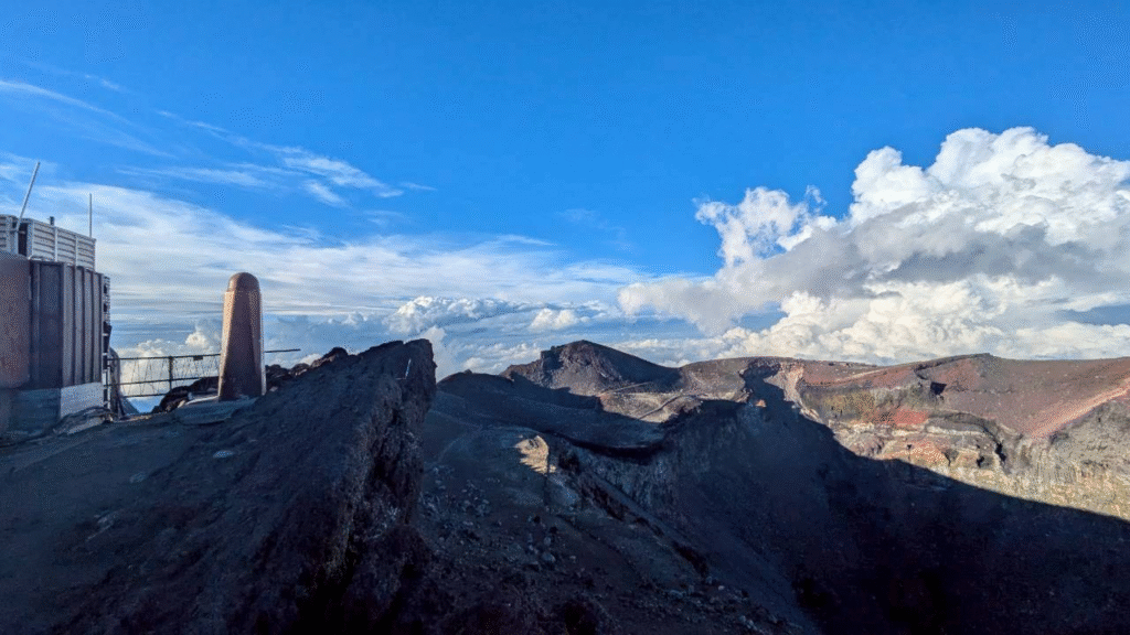 夕刻、富士山最高点・剣ヶ峰に到達。眼下に広がる景色は圧巻であり、日本一の頂に立った実感があった。