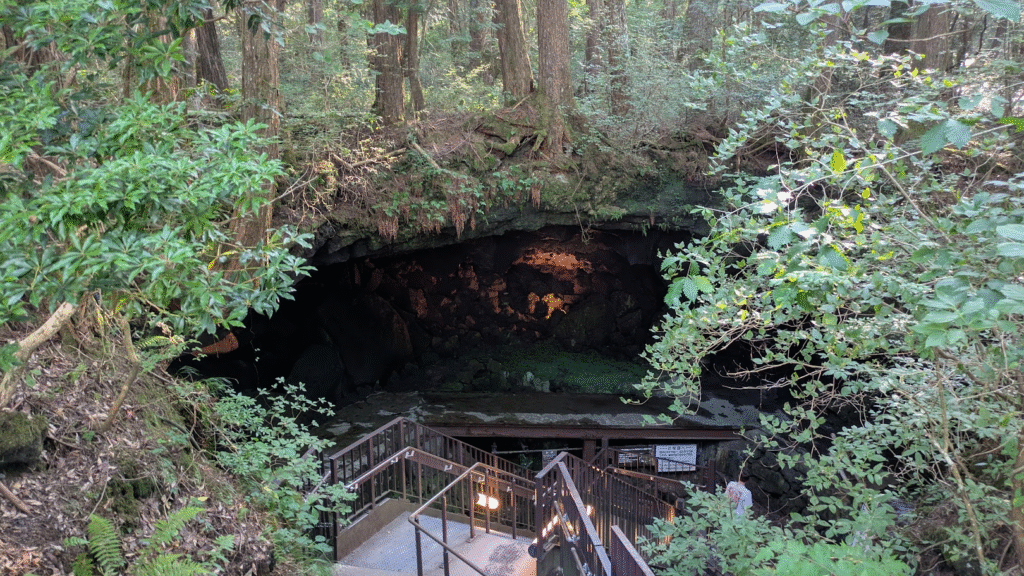 下山後は「富嶽温泉 花の湯」で汗を流し、さらに青木ヶ原樹海の富岳風穴・鳴沢氷穴を見学した。洞窟内は真夏とは思えぬほど冷気に満ちていた。
