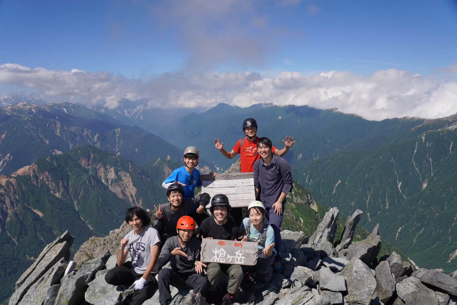 全員が揃ったところで槍の穂先へ。はしごは少し緊張したものの、一歩ずつ登れば問題なし。山頂は10数人でいっぱいになる小さな岩場で、眺めは最高。