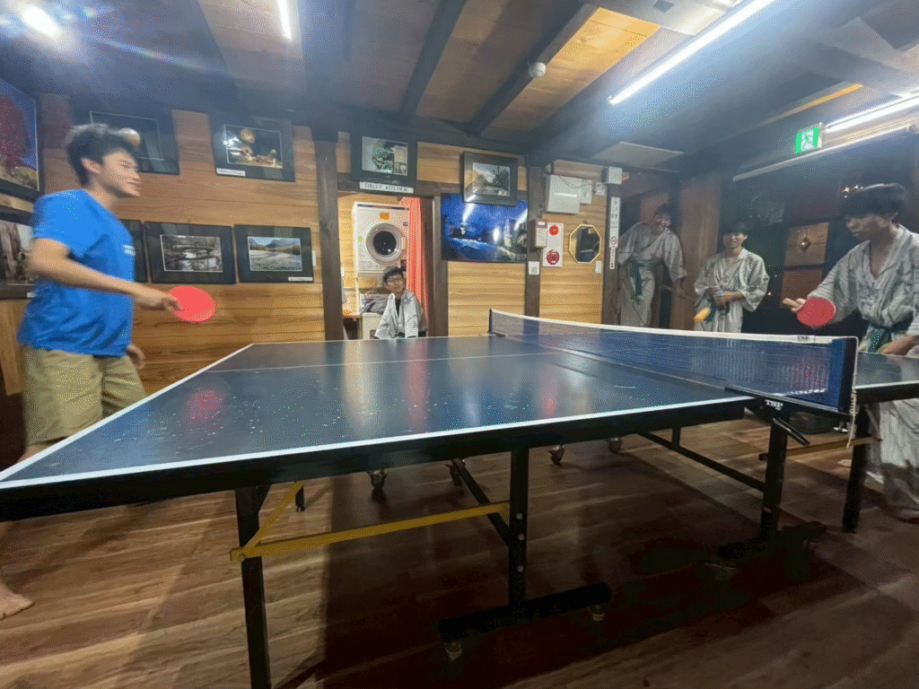 買い出しをして王将で腹ごしらえしたあとは、旅館の離れにある一棟貸しの宿へ。温泉も卓球台もあって最高の環境。お風呂に入って翌日の夕飯準備をしつつ、卓球大会が始まった。