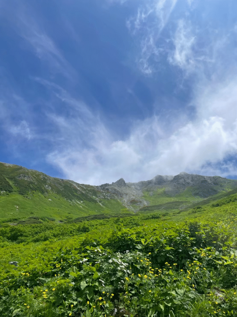 白出沢までは穏やかな林道歩き。槍平小屋で水を補給し、樹林帯を抜けると青空と緑が広がる夏山らしい景色。それでも飛騨沢の急登はかなり堪えるもので、ザレた道を黙々と登りながら、それぞれ自分のペースで山頂を目指しました。