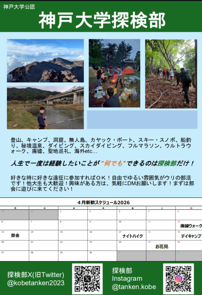 神戸大学に合格されたみなさんおめでとうございます! 探検部では登山、ウィンタースポーツ、ウルトラウォーク、ゲテモノ遠征などやりたいことがなんでも出来ます! 少しでも興味のある方は4/13にある部会への参加や廃線ウォークへの参加お待ちしております!!